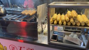 焼きとうもろこしのタレが焦げる香ばしい匂いに誘われ、私たちは少し離れたところで列の流れを見守りました。夜市は「食べる」だけでなく、目の前で仕上がっていく工程そのものがエンタメのようで、待ち時間が不思議と苦になりません。
