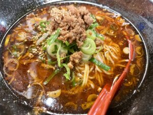 中太麺は弾力があり、辛さの中でもしっかりと小麦の風味が感じられます。タレには粗挽き唐辛子と花椒、そして少量のニンニク油ーー「辛いだけじゃない」のがこの店の魅力で、噛むほどに香ばしさと深い旨味が立ち上がります。