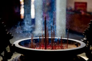 早朝の境内に漂う線香の煙(イメージ画像です。)