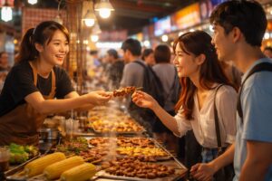 夜市では、若いスタッフが活気ある声で客を迎えています。単なるアルバイト作業ではなく、自分たちが街の文化を作っているという自負のようなものを感じました。